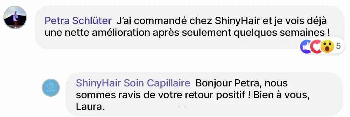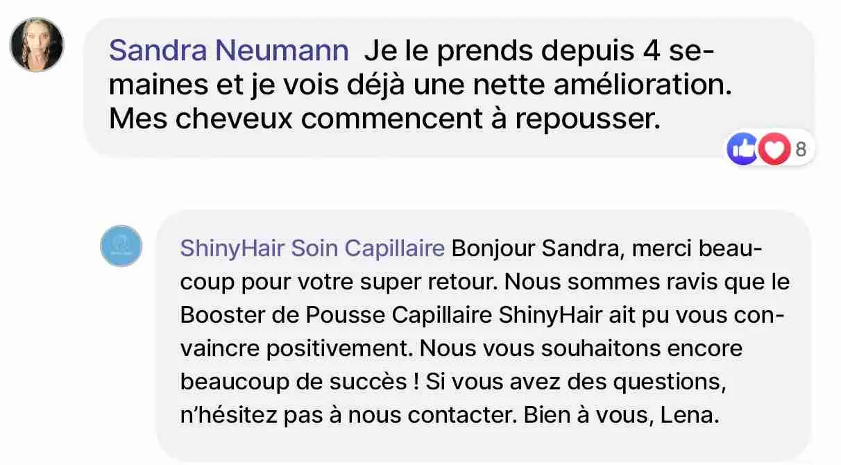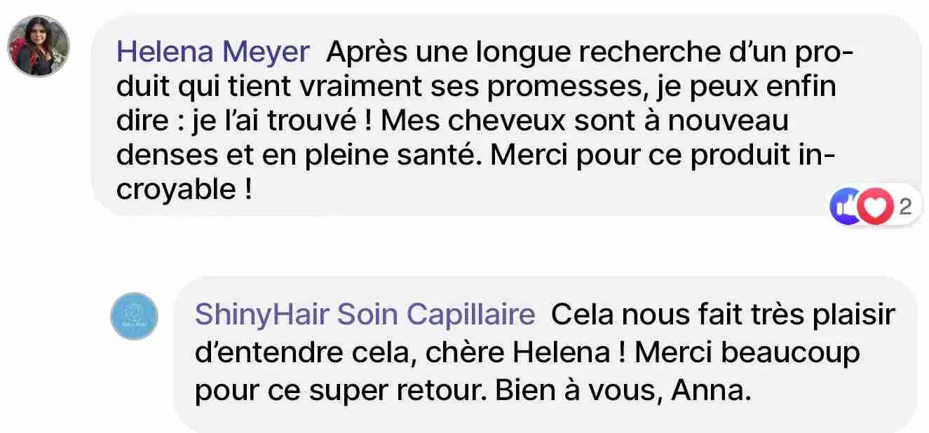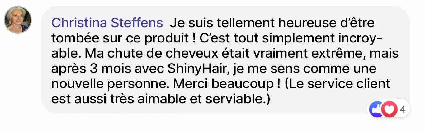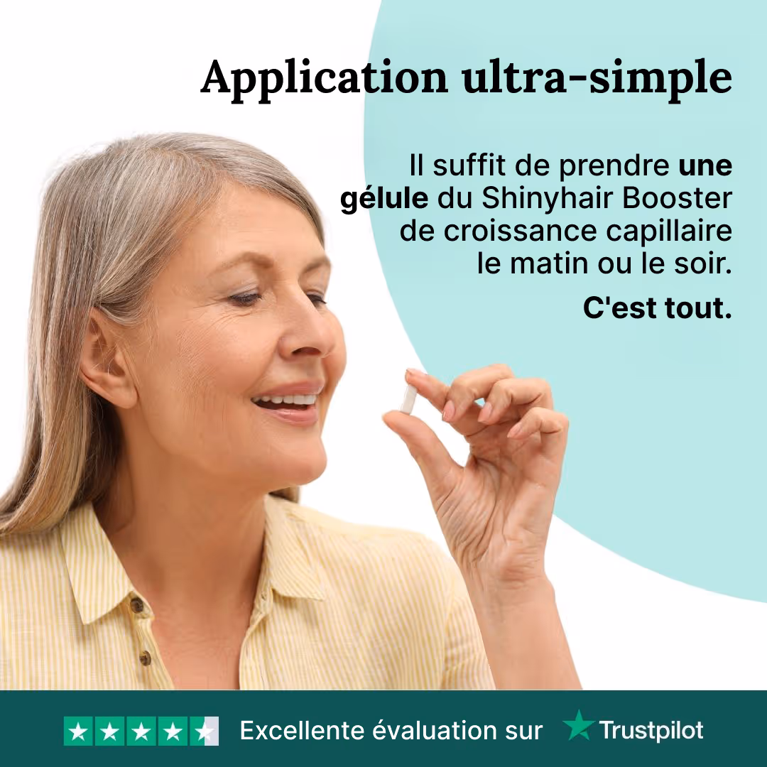 Après la naissance de mon enfant, je perdais des cheveux sans fin et cela ne s'arrêtait plus. J'ai essayé toutes sortes de choses et seul le booster de croissance capillaire de ShinyHair m'a réellement aidée.